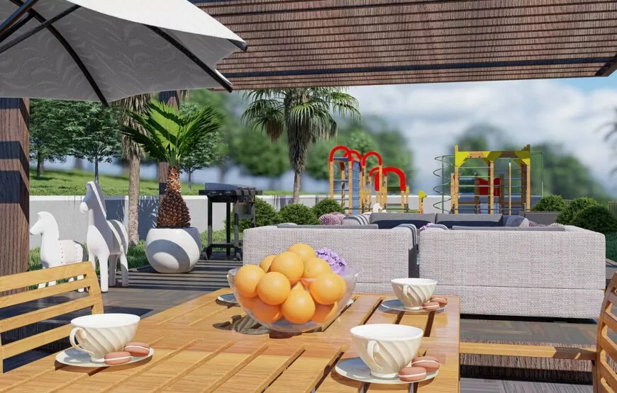 На территории комплекса расположены бассейны, сауны, массажный кабинет, зоны для барбекю и отдыха, мини-бар, спортзал. ЖК круглосуточно охраняется. До песчаного пляжа всего 1,7 км.