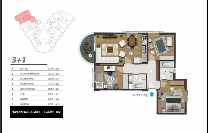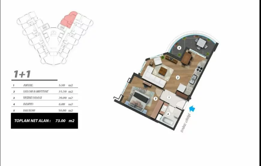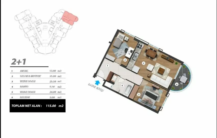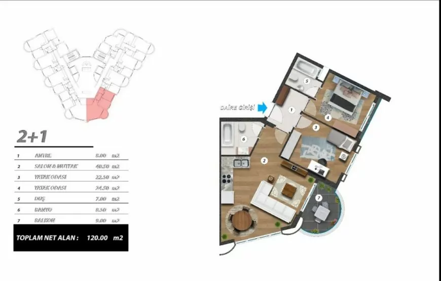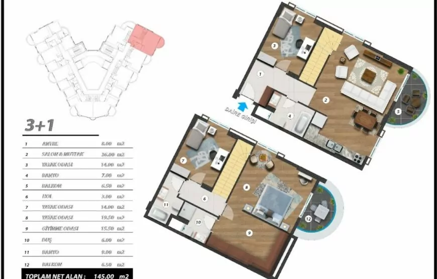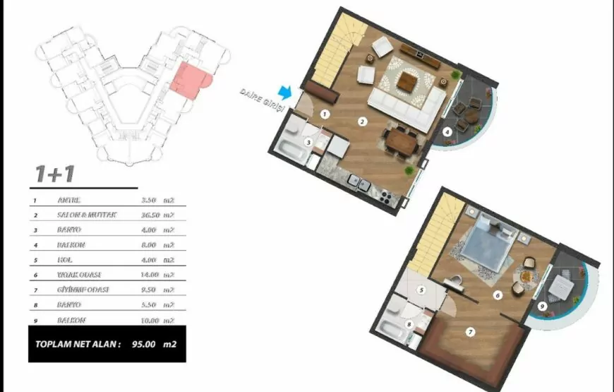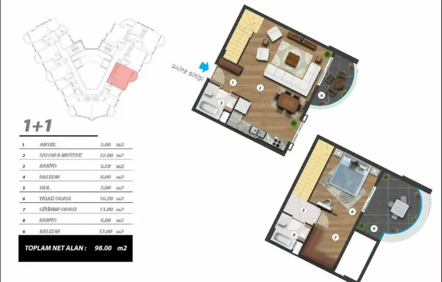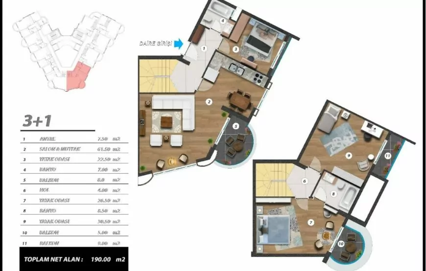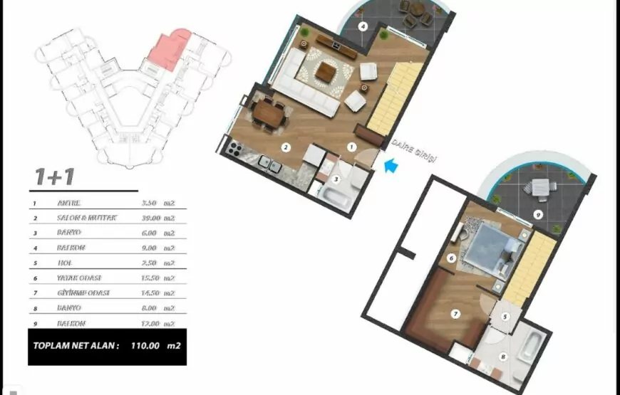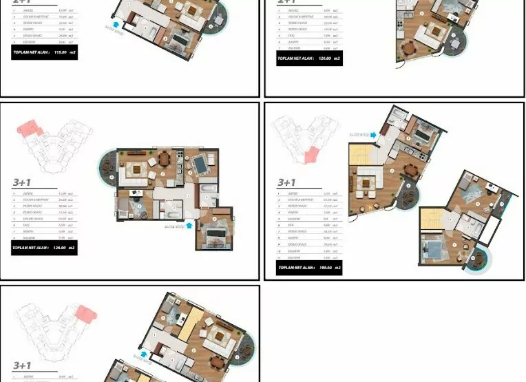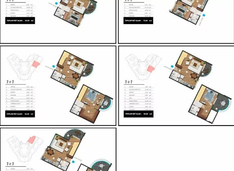 Всего в комплексе 107 квартир по 9 на каждом этаже: 1+1 (65м2), 2+1 (115 м2), 3+1 (135м2) и 6 пентхаусов.